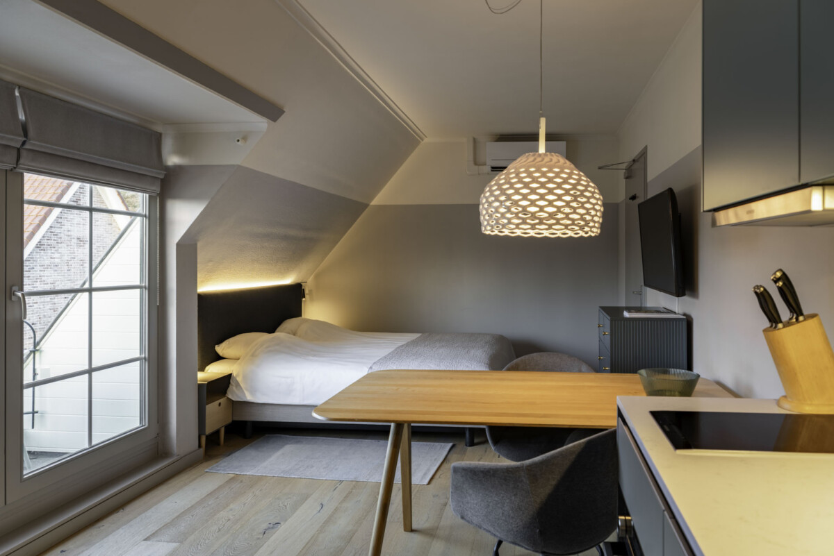 The small studios offer an intimate and comfortable place to stay on the Zeeland coast. With a private terrace or balcony, there is space to be outside and enjoy the moment. One studio (no. 47) can be connected to a penthouse, allowing them to be booked together.